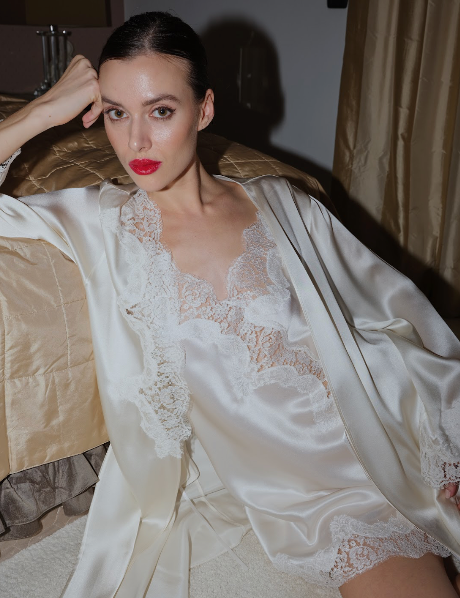 DIAMOND SILK SHORT ROBE ECRU